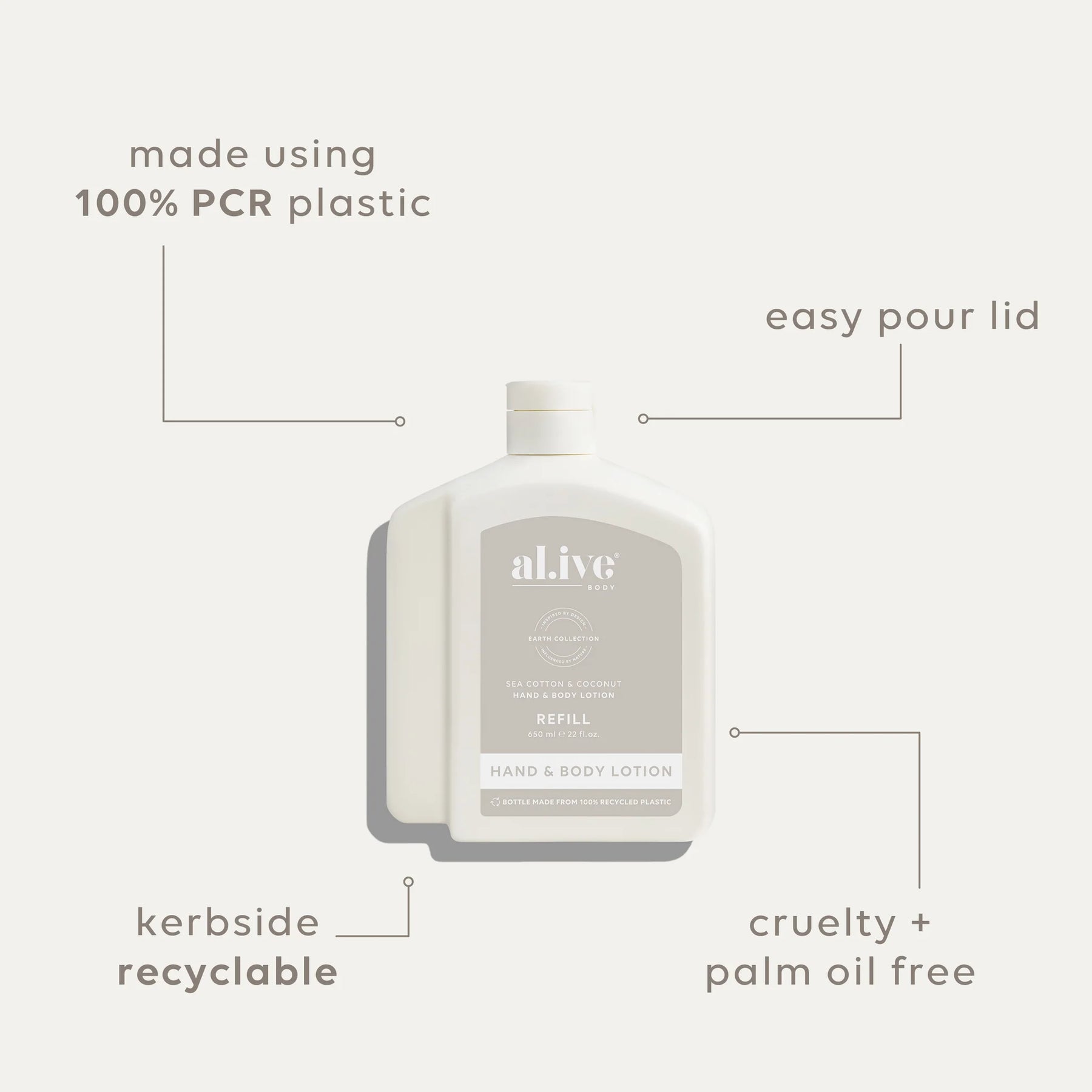 The al.ive body 650ml Sea Cotton & Coconut Lotion Refill is housed in a durable bottle made from 100% post-consumer recycled (PCR) plastic, offering a considered alternative to single-use packaging.