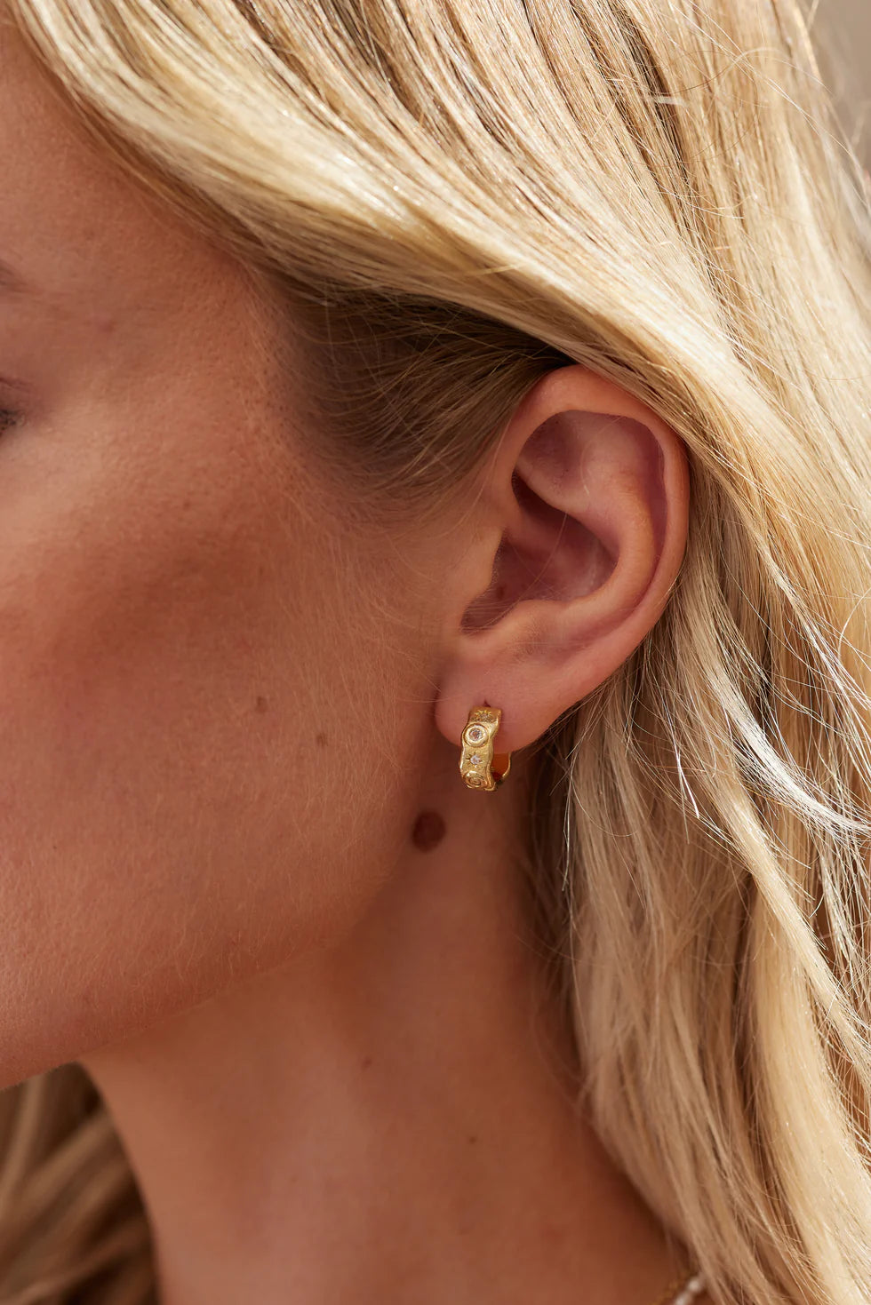Embrace celestial charm with the Cosmic Hoops. Glowing White Topaz sits at the heart of every starburst, with bezel-set stones illuminating the spaces between.