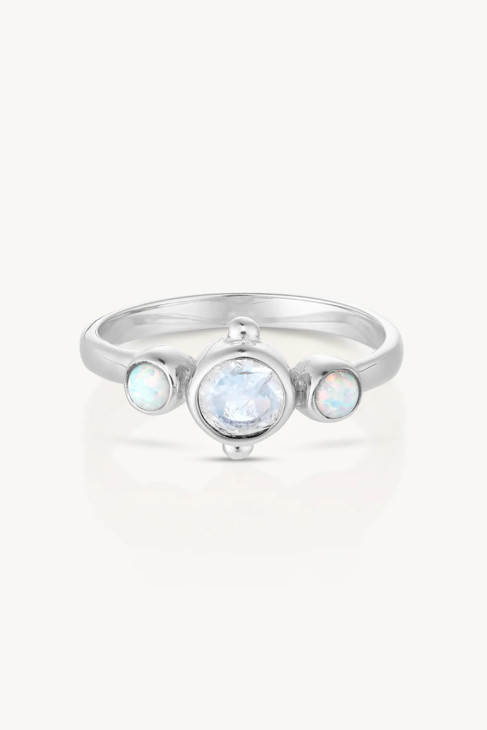 The Cora ring is a dainty band featuring a faceted moonstone and partnered with 2 luminous opals and with dainty dot detailing.