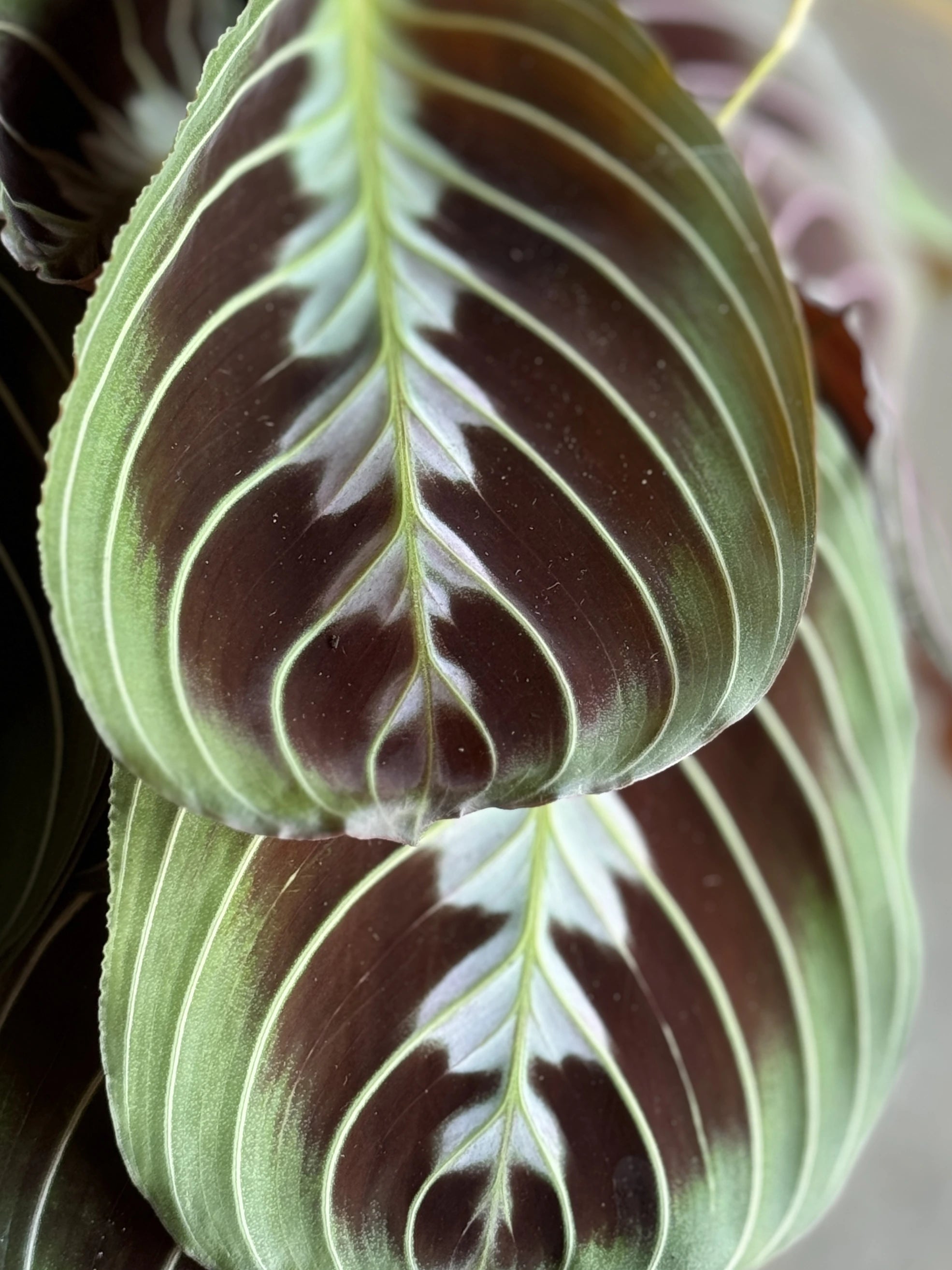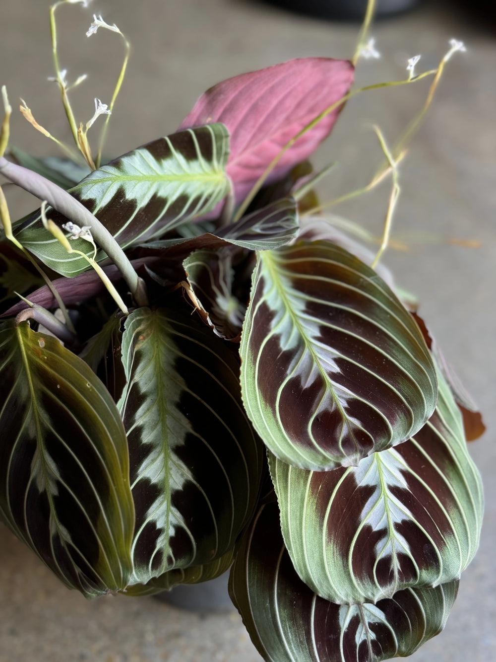 Black Maranta, often called the Prayer Plant, is appreciated for its striking, dark-toned leaves accented by subtle patterns of lighter green.