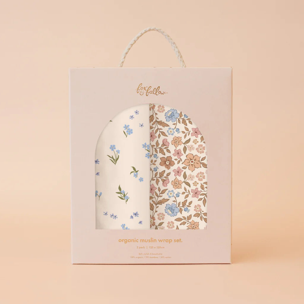 This set includes two beautiful organic muslin wraps made from the softest cotton bamboo blend, packaged in a luxe paper box with gold foil accents and rope handle.