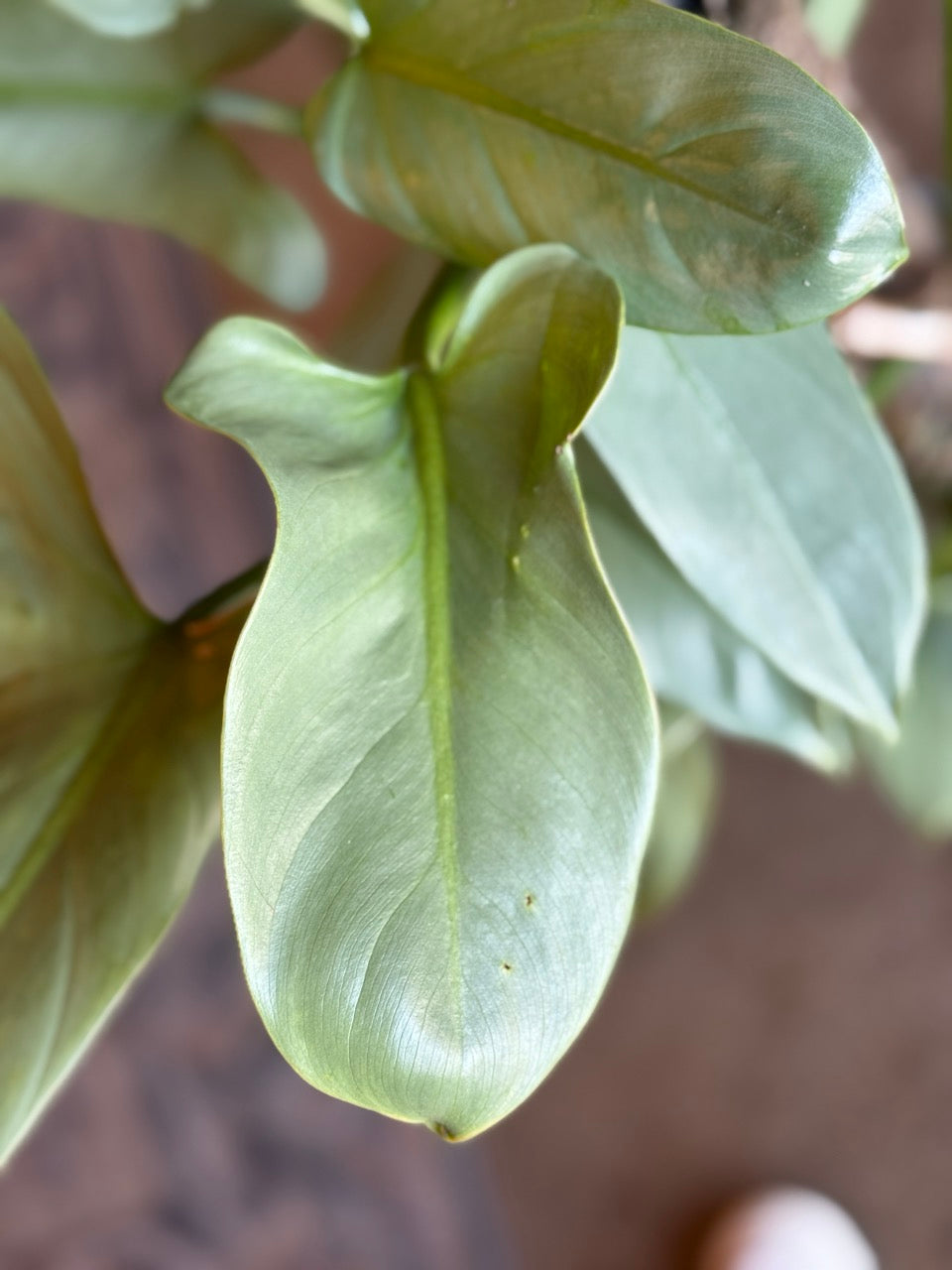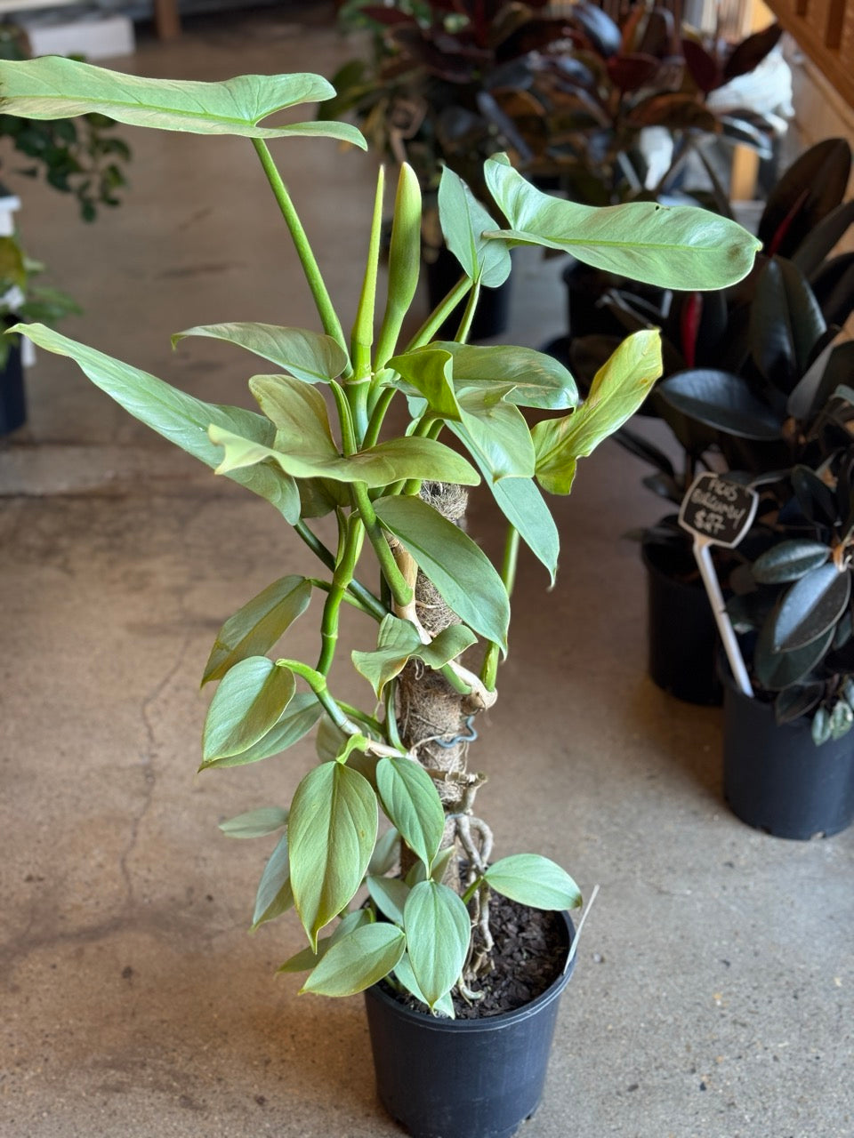 Philodendron hastatum produces elongated, arrow-shaped leaves with a smooth, metallic sheen that gives them a distinctive silvery tone. As the plant matures and climbs, the leaves grow larger and more dramatic, lending a bold, sculptural quality to its display. Its refined colour and elegant form make it a striking choice for plant enthusiasts and collectors alike, particularly when supported by a pole or trellis.